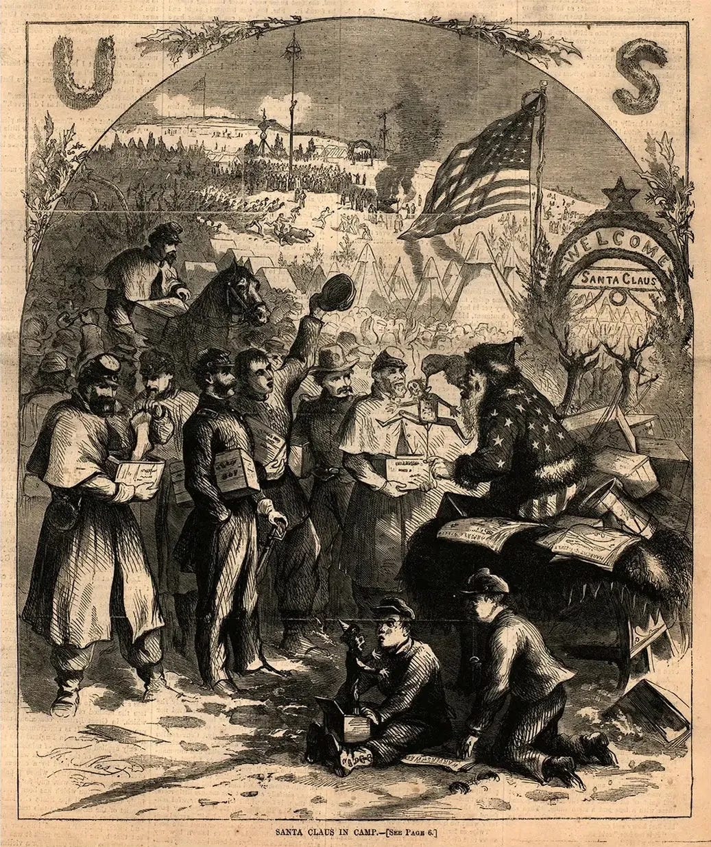“In this image,” wrote librarian and archivist Rachael DiEleuterio, “Santa visits a Union encampment, distributing gifts to soldiers. Most notably, Nast dressed Santa in a coat patterned with stars and trousers striped like the American flag. Santa holds a puppet labeled ‘Jeff,’ a not-so-subtle swipe at Confederate president Jefferson Davis. The message was unmistakable: even Santa supported the Union cause. Over the years, Nast continued to refine and elaborate Santa’s image. His illustrations provided the first known references to Santa living at the North Pole and maintaining a toy workshop—details that soon became fixtures of the Santa Claus mythology.”