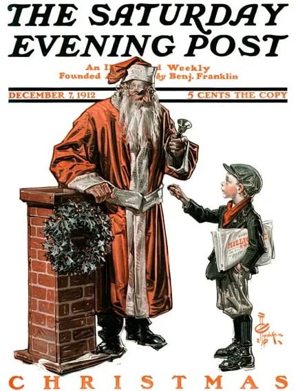 Then, in 1917, the Saturday Evening Post publishes J.C. Leyendecker’s rather svelte sidewalk Santa. He’s clothed in red and white. Why red and white? Well, in those days, a palette of red, yellow, white, and black is all an illustrator needed to create a “full-color” piece. It was faster to paint with a limited palette. And easier (and cheaper) to print.