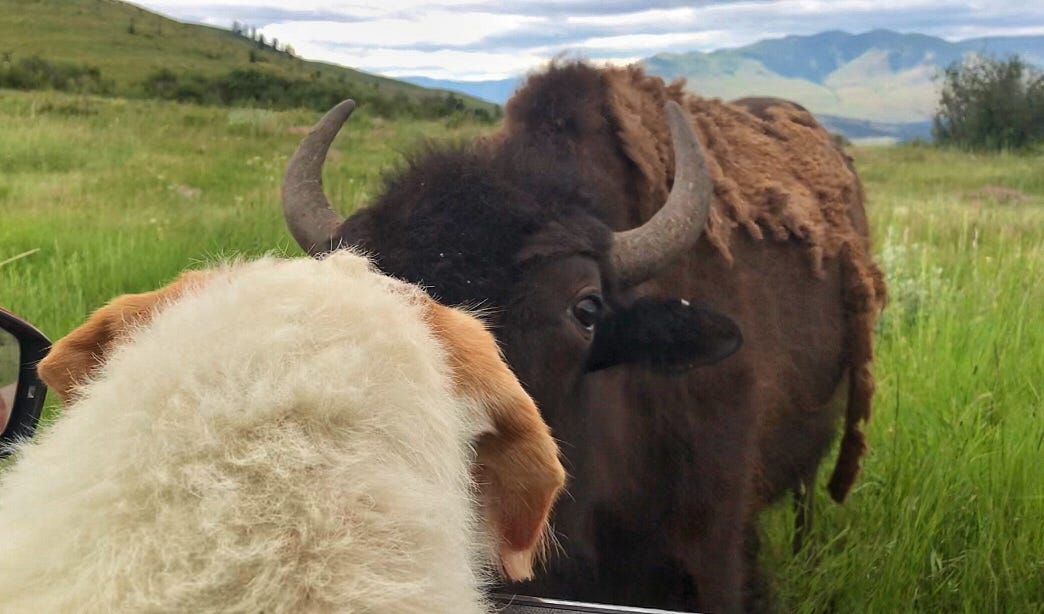 And here we were, two unlikely survivors with a bison herd closing around us, so close we could hear every breath, grunt, and snort; so intimate; we looked into each other’s eyes.